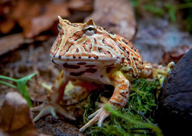 Pacman frogs are a popular species found in Brazil, Paraguay, Argentina, and Uruguay, especially rainforests. They get their name from their large mouths which they can open so wide to eat almost anything, even things their own size. They eat by ambushing their prey. They are easy to care for, making them good frogs for beginners!